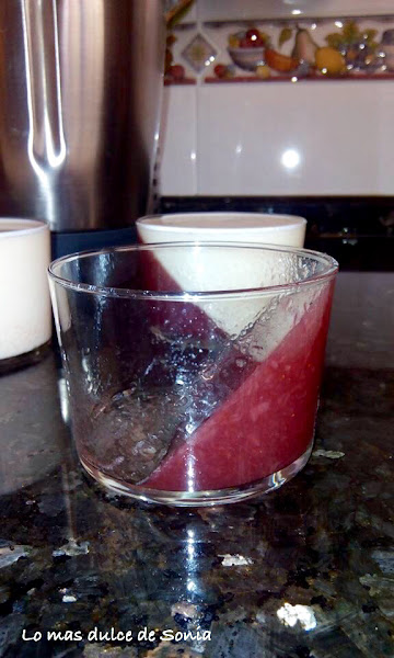 En mi caso, hice la gelatina de fresa, puse en los vasitos volcados (mirar las fotos), metí en el frigorífico unas horas y después hice la pannacotta.