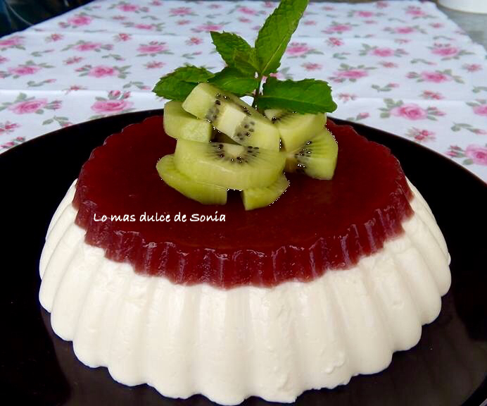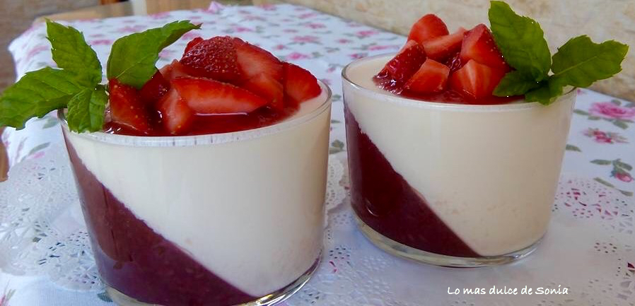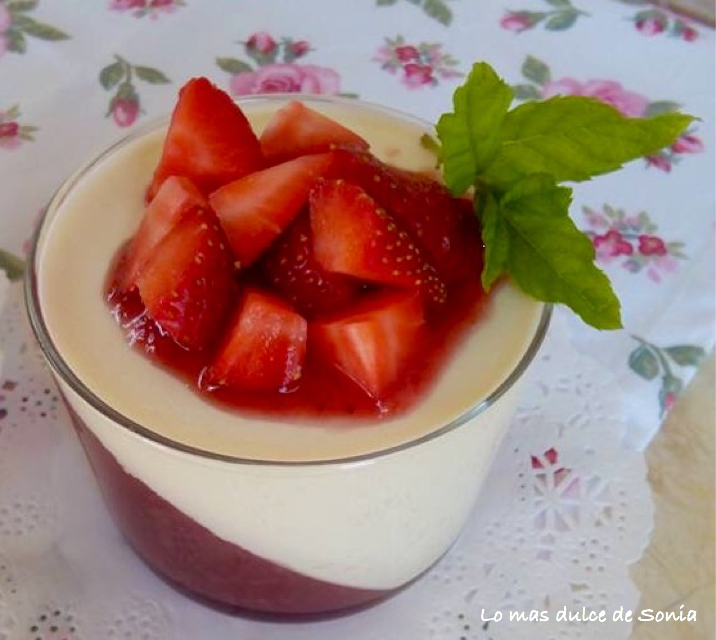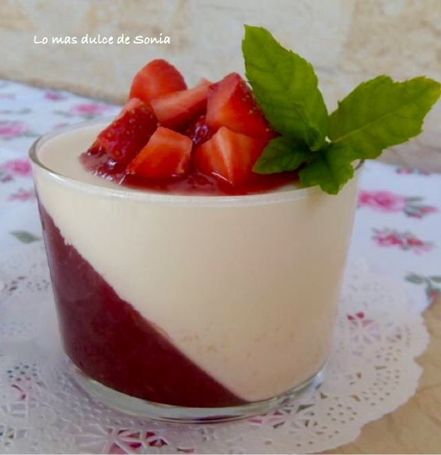 Si queréis hacerla de forma individual, yo he hecho vasitos mitad gelatina y mitad pannacotta. Pensad que las mezclas tienen que estar frías para que no se mezclen.