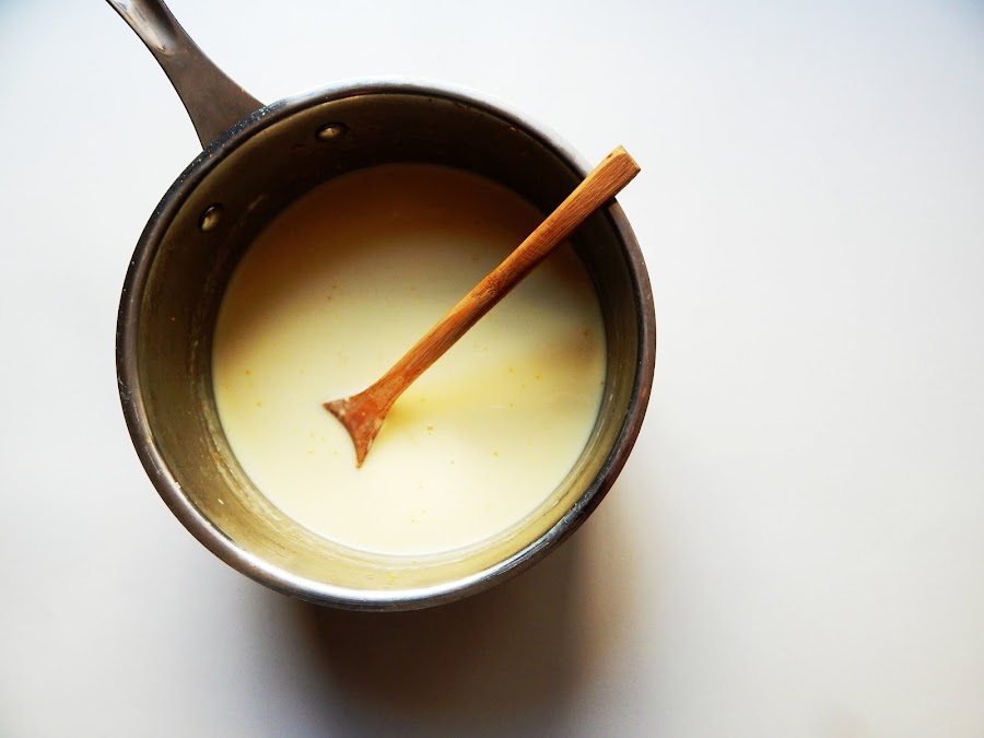 Colocamos la crema para batir en una olla grande y llevamos a hervor lentamente. Una vez que la crema comience a subir, ajustamos el fuego para mantener un hervor constante. Cocinamos por unos 5 minutos hasta casi reducirlo a un tercio.