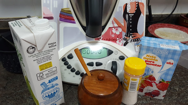 2.- Ahora en el vaso de la thermomix volcamos la nata (crema de leche), la leche, y los azúcares. Programamos 6 minutos, 80º, velocidad 3.
