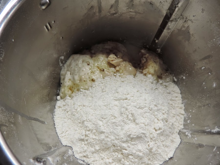 Ponemos agua en el vaso del thermomix, programamos 6 minutos, 37º, velocidad 2. Cuando llegue a la temperatura, cubrimos la bola de masa. Y dejamos reposar.