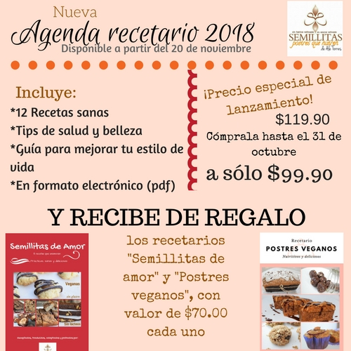 Estará disponible a partir del 20 de noviembre, peeeeero si la compran hoy o antes del 31 de octubre, en preventa, recibirán de INMEDIATO y GRATIS los dos recetarios electrónicos: "Semillitas de amor" y "Postres veganos".