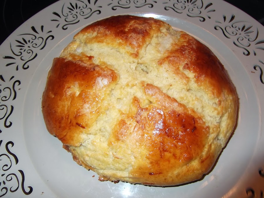 Pasado este tiempo, precalentamos el horno a 180º con temperatura arriba y abajo. Con un cuchillo formamos una cruz, batimos el huevo que nos quedaba y pincelamos el bollo. Con los