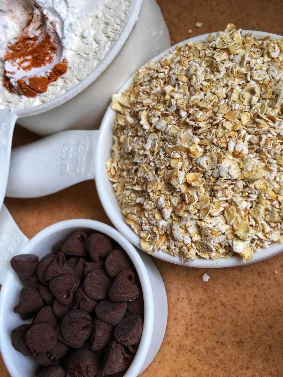 1. Procesar los ingredientes secos y reservar. Si no deseas procesar o no tienes procesadora, puedes usar avena molida o si prefieres, puedes usar las hojuelas de avena entera para agregar textura!!