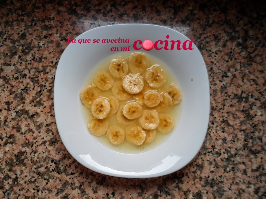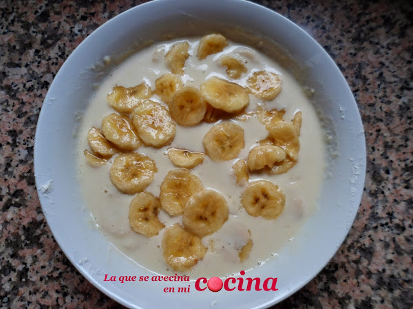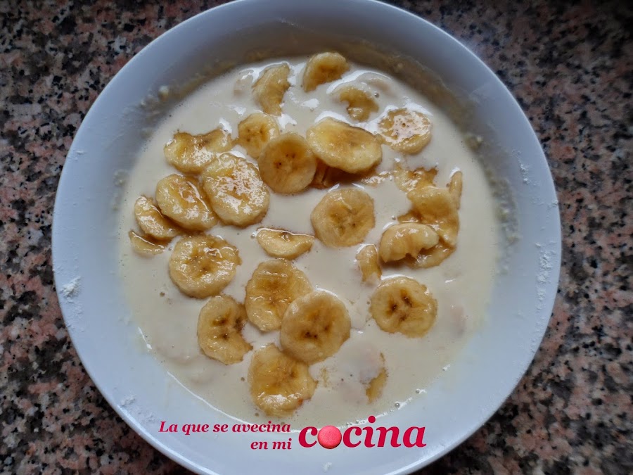 Escurrimos los plátanos que teníamos reservados y los echamos en la masa anterior.