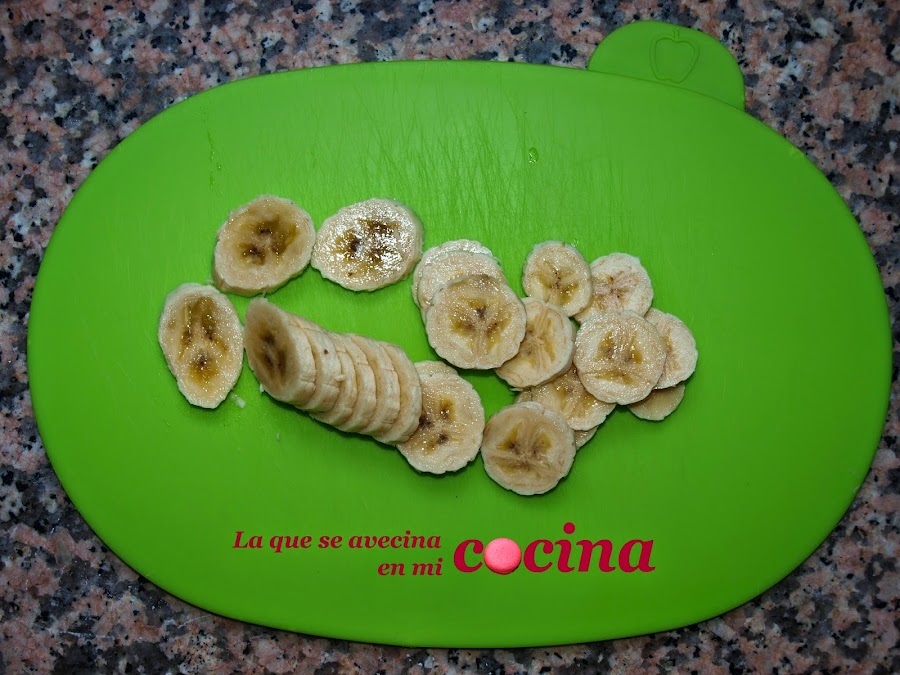 Comenzaremos troceando en rodajas finitas los 4 plátanos y exprimiendo el zumo de los limones. Una vez lo tengamos, remojaremos las rodajas de plátano en el zumo de limón.