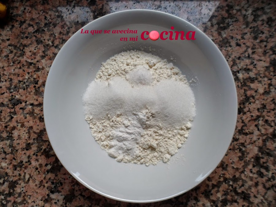 Ahora ponemos en un bol la harina, el azúcar, la sal y la levadura. Y en otro batimos el huevo, el agua y la leche.