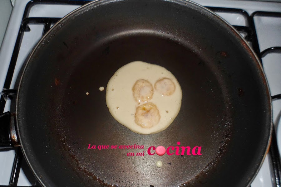 Una vez que hayamos conseguido el punto exacto de engrasado de la sartén iremos echando la masa. Yo para ello utilicé una cuchara de sopa y fui echando tres cucharadas de masa, las dos últimas sobre el centro de la primera. De esta manera (y con la rectificación que hice en la masa) veremos como nuestro panqueque se expande solito haciéndose redondo. Además tendremos que tener cuidado de no poner demasiadas rodajas de plátano porque sino luego para darles la vuelta pesan demasiado y se parten. Así que mejor unas tres rodajitas y sin apelotonar.