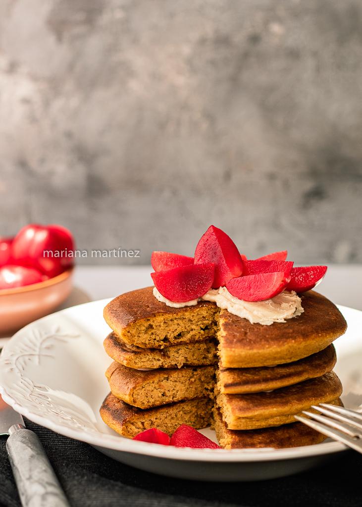 La calabaza tiene la propiedad de hacer que las preparaciones tengan mas humedad y un leve dulzor; además de un color muy atractivo. Estos panqueques quedan muy esponjosos, suaves y húmedos por dentro.