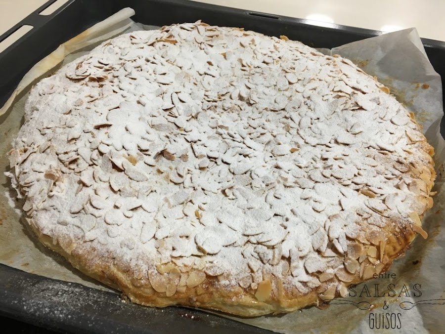 Echa la crema de almendras en el centro de la lámina de hojaldre y extiéndela dejando un centímetro de borde, el cual pintaremos con huevo batido. Cubre con la otra lámina de hojaldre y sella con un tenedor para que no se salga la crema.