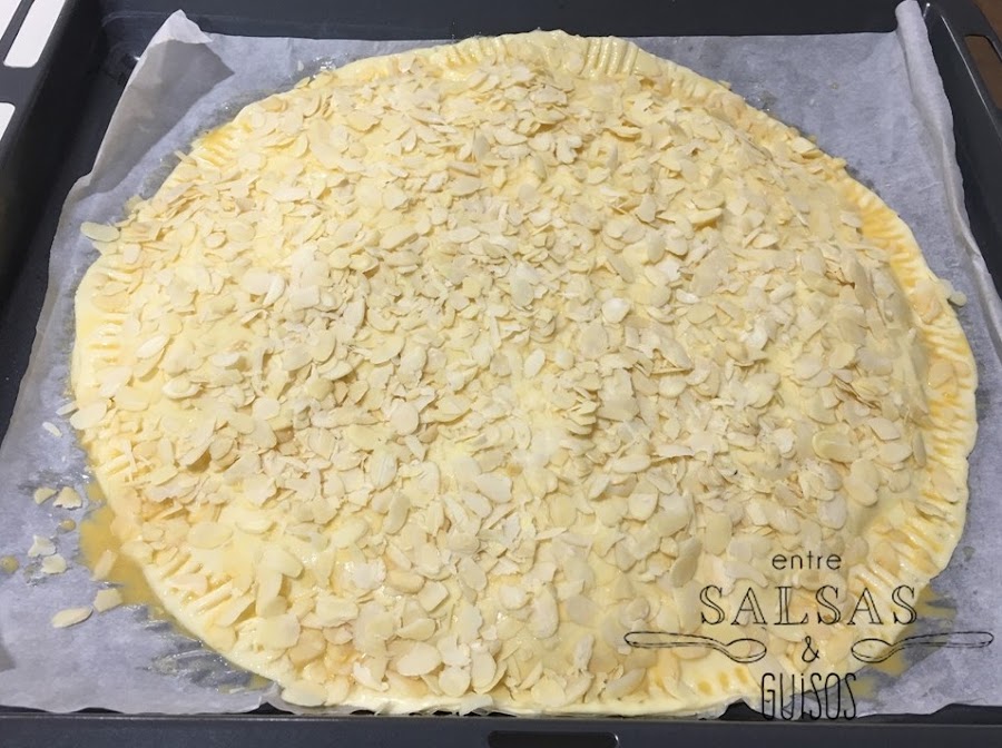 Pinta con un huevo batido y echa pon encima almendra laminada.