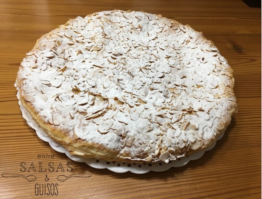 Parece ser que tiene su origen en Francia, allí lo preparan con una crema pastelera de almendras, que es como yo lo he hecho, "franchi-pan" y por proximidad lo adoptaron en Donostia y también le dieron este nombre más local, lo preparan sin almendra en la crema... aunque yo creo que habrá de todo.