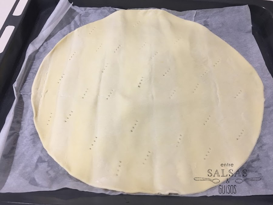 Pon una lámina de hojalde en una bandeja de horno, sobre papel de hornear. Pincha toda la superficie para que no suba mucho