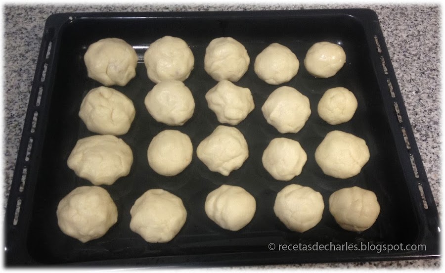 Cuando la masa esté lista, en una bandeja de horno untamos un poco de aceite y con las manos vamos cortando porciones y haciendo bolas del tamaño que queramos. Una vez listas las colocamos sobre la bandeja.