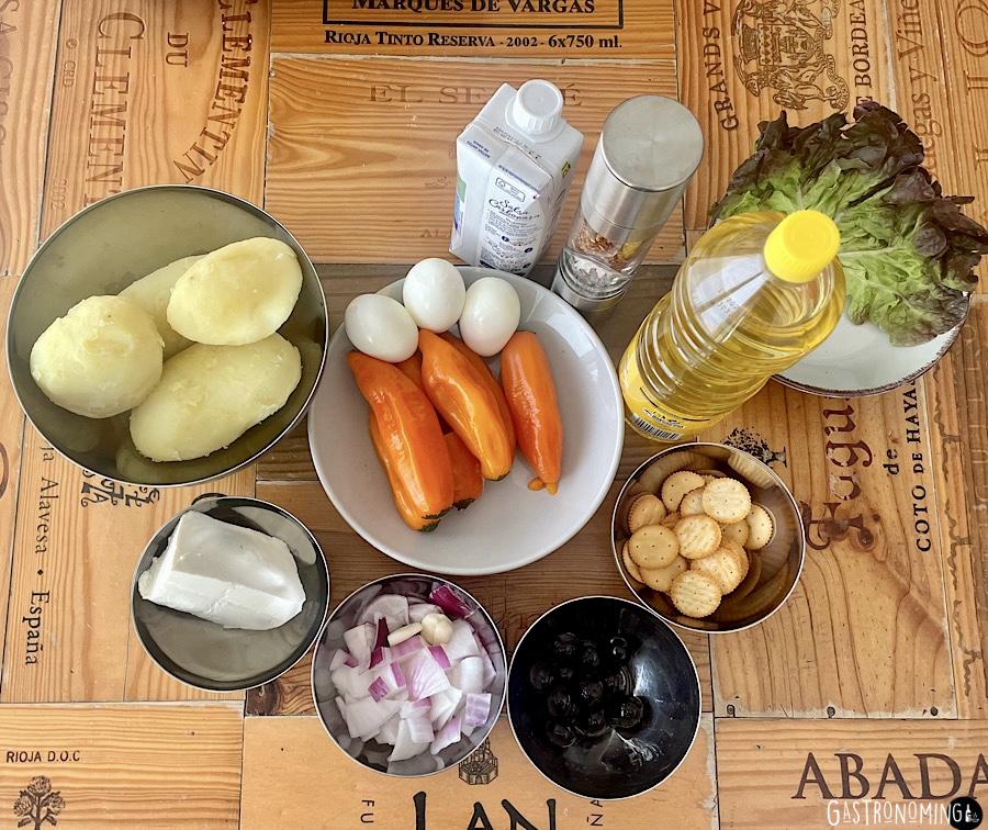 1. Lo primero, debemos tener cocidos y pelados los huevos y las patatas. Corta ambos y reserva.2. En una sartén ponemos a fuego medio-alto 3 cucharadas de aceite y vamos a soasar los ajíes, cebolla y ajos hasta dorar bien. Reservamos y dejamos enfriar.