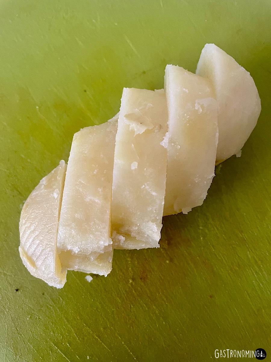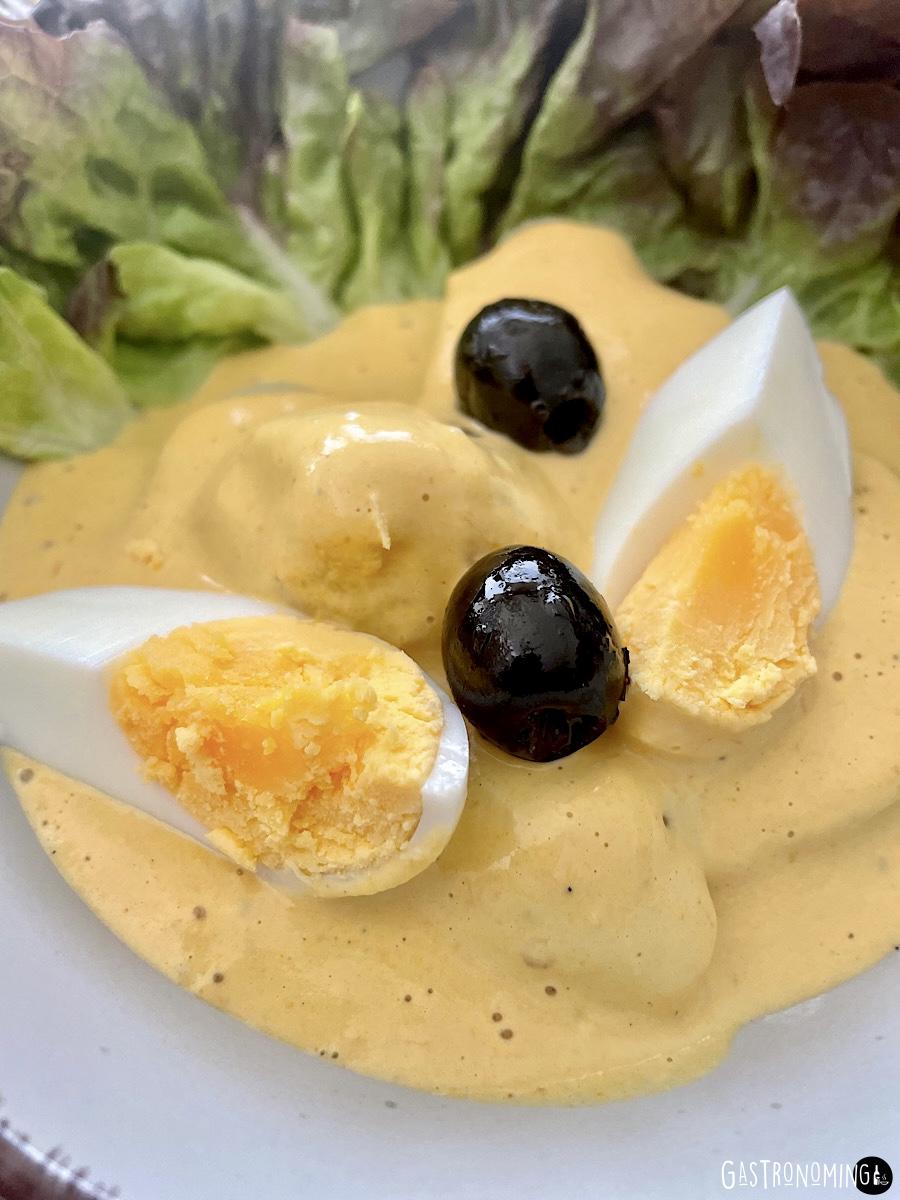 4. Colocamos unas hojas de lechuga en un plato, encima las patatas cocidas y cortadas en rodajas de medio centímetro, rociamos la salsa por encima de las patatas hasta cubrirlas completamente de salsa.