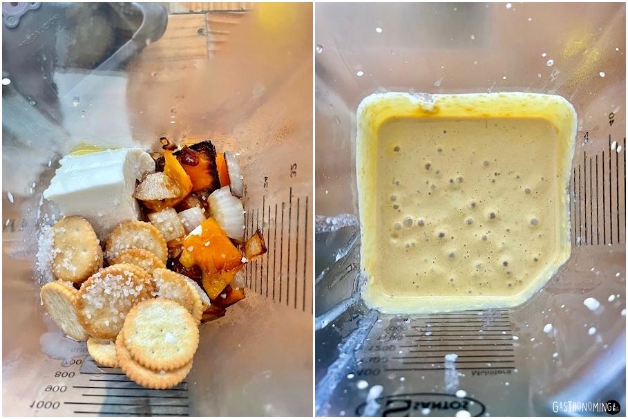 3. Una vez frío, lo pasamos a una batidora o procesador y añadimos, sal, galletas, queso, aceite y leche vaporada y licuamos hasta obtener una salsa espesa, puedes regular el espesor con más aceite o lo contrario con menos. Guardamos en frío, mientras más frío, más espesa.