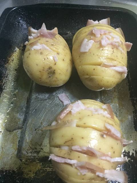 Limpias bien las papas y pones en la parte de abajo un palito de broche o la pones entre 2 palitos de sushi para ayudar a cortarla pero sin llegar a abajo de todo (que se abra como un libro).Lo mejor es que las papas sean chatas y alargadas.