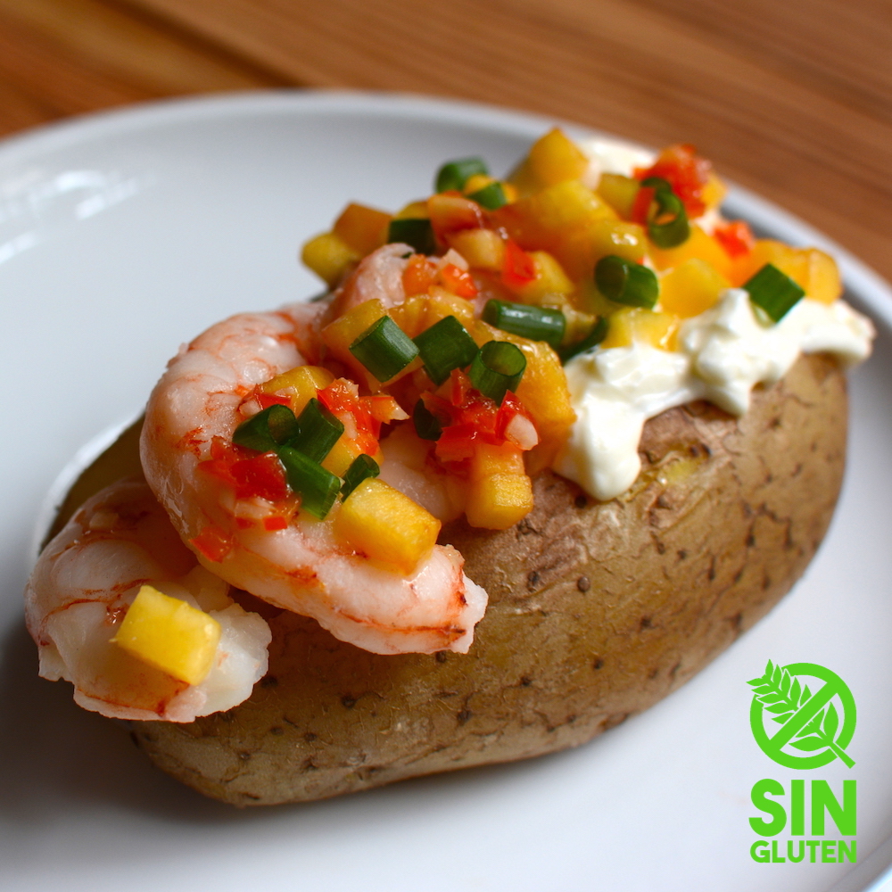 Papas rellenas con camarones, queso crema y duraznos con un pesto chino que la hacen única y llena de sabor. Fresca, elegante, ideal para comer como entrada o en un almuerzo o cena liviano y acompañarlas con un mix de hojas verdes.