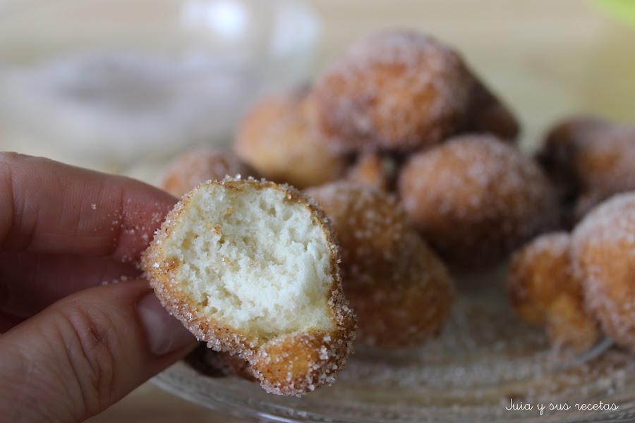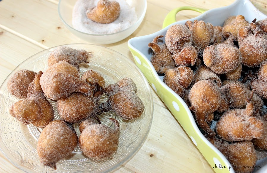 Con un cucharón o cuchara, cogemos un poco de la masa y la freímos en una sartén con aceite caliente. Hasta que se hinchen y se doren.