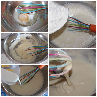 Añadimos la leche, el azúcar y harina tamizada con la levadura.