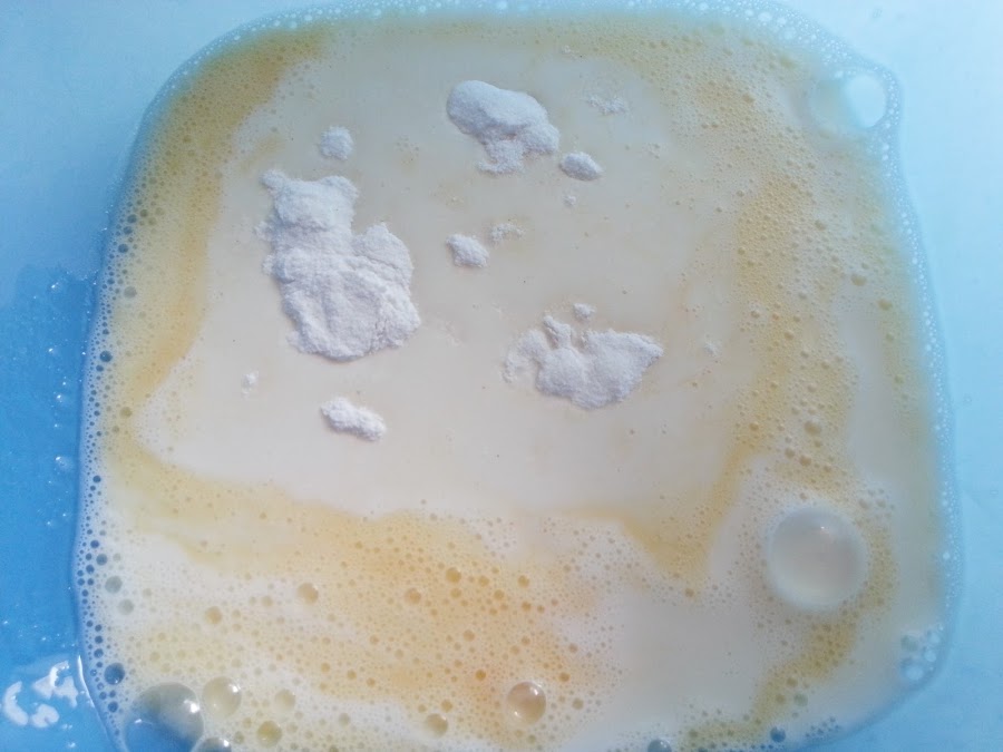 2. - En un bol batimos el huevo y agregamos la pizca de sal, la levadura y la leche.