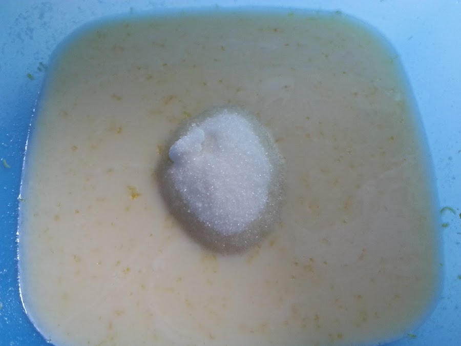 3. - Añadimos la ralladura de limón, el azúcar y la harina . Debe quedar una masa no demasiado espesa, id probando con una hoja y vais viendo como os queda, cuando esté a vuestro gusto, entonces, podéis freír el resto.