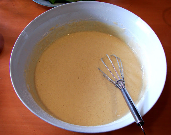 Se mezcla la leche con el agua y las yemas de huevo. Se bate bien y se le añade poco a poco la harina sin dejar de batir. Se agrega la raspadura de limón, el azúcar y la canela.