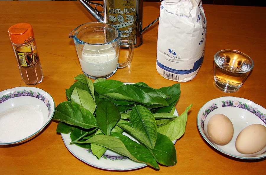125 ml. de leche, 125 ml. de agua, 2 huevos, 175 gr. de harina, raspadura de limón, 50 gr. de azúcar, hojas de limonero, aceite y canela molida. Para rebozar: canela molida y azúcar.
