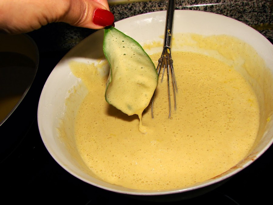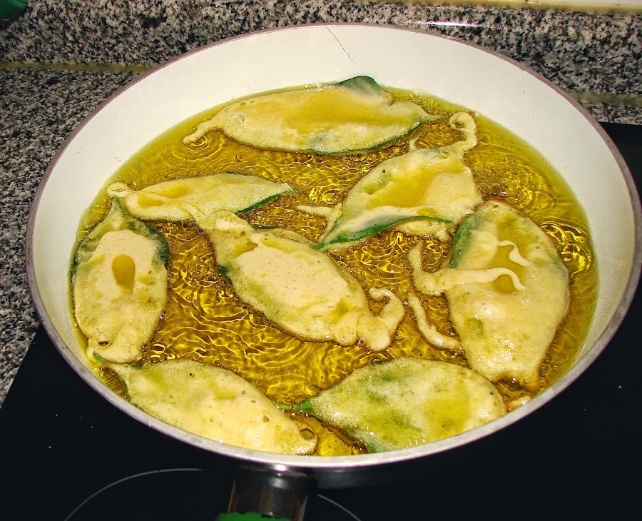 Después se pone a calentar bastante aceite en una sartén y cuando está bien caliente, se van remojando las hojas de limonero en la masa.