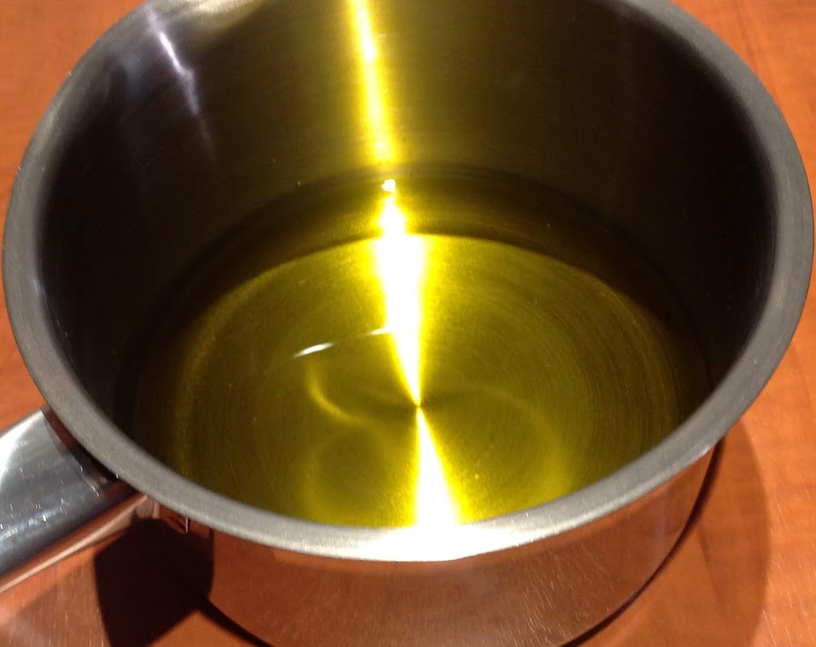 Una vez haya reposado la masa, pon un poco de aceite a calentar en un cazo para freír las hojas. El suficiente para que queden bien fritas.