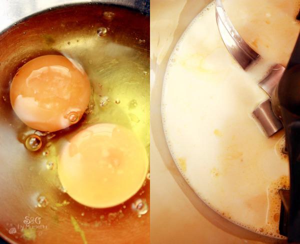 A continuación, le añadimos la leche y los huevos previamente batidos, para que así se integre todo mejor! y mezclamos unos segundos a velocidad 4 hasta que esté todo bien mezclado.