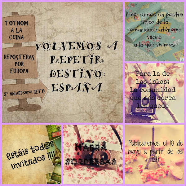 Este mes de Mayo, el reto Reposteras por Europa cumple dos años, y la organizadora del reto, Pili de Tothom a la cuina, ha decidido que lo celebremos con un destino especial....este mes no salimos de viaje por Europa, nos quedamos en España!!!