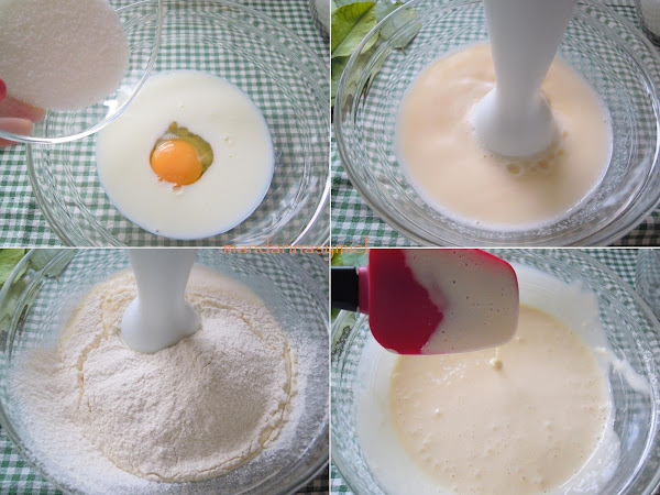 Añade la harina con la levadura tamizadas, echa la pizca de sal y sigue batiendo hasta que quede una masa no muy espesa.