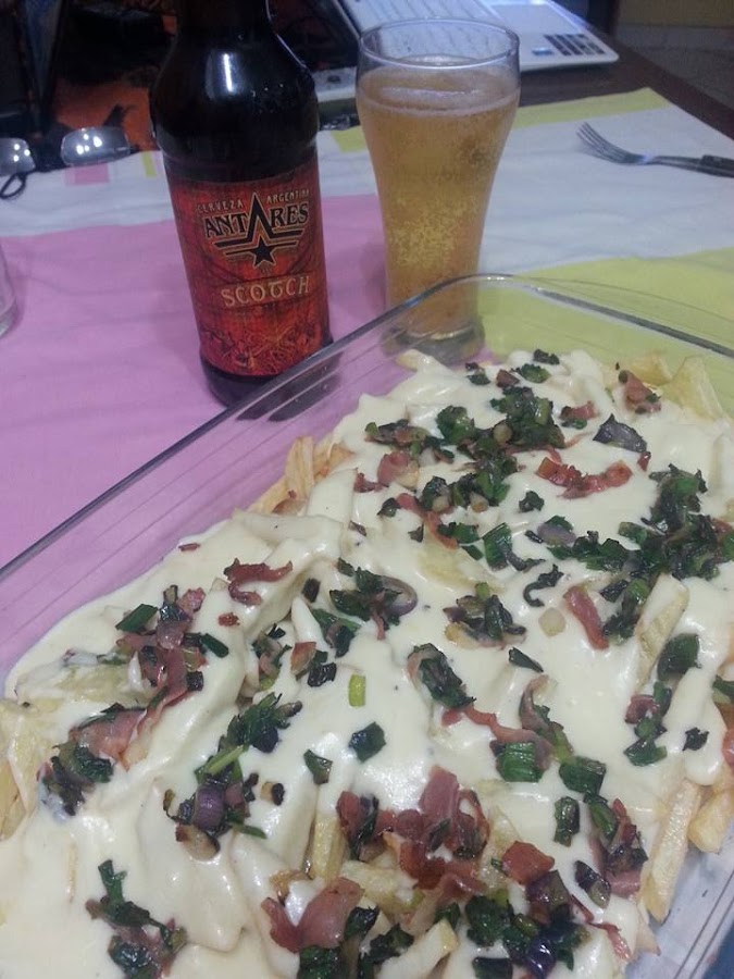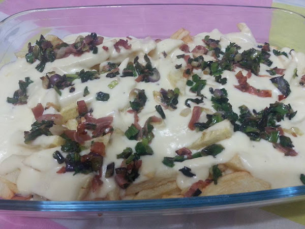 Freír en abundante aceite las papas cortadas en bastones. Colocar las papas fritas en una fuente y cubrir con la salsa. Sobre la salsa esparcir la cebolla de verdeo y la panceta frita.