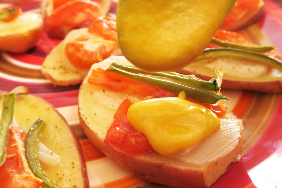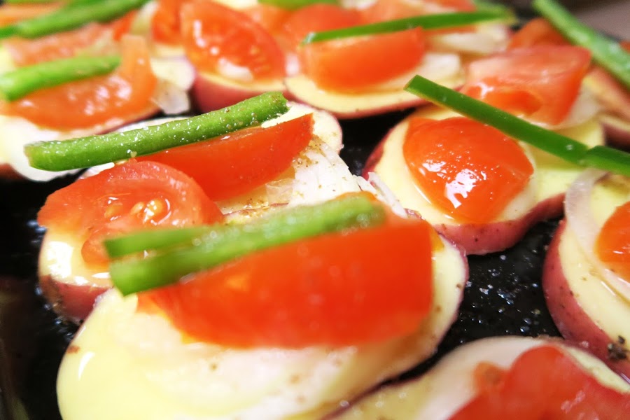 Precalentar el horno a 200° y en una bandeja, o lata del mismo horno, agregar aceite de oliva y luego poner las papas/patatas ordenadas, de manera que no queden una encima de otra. Salpimentar y agregar la cebolla, luego el tomate y el pimentón. Si es necesario, añadir más sal y pimienta.