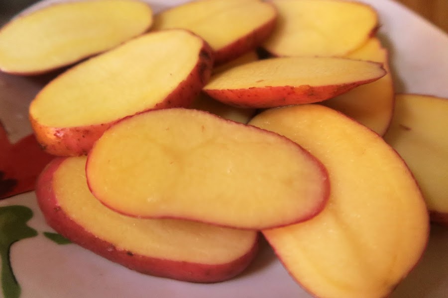 Lavar muy bien las papas/patatas y cortarlas en rodajas, de manera vertical, para que no queden tan pequeñas. También cortar la cebolla en pluma, los tomates (con cáscaras) por mitades y en rodajas y el pimentón a lo largo.