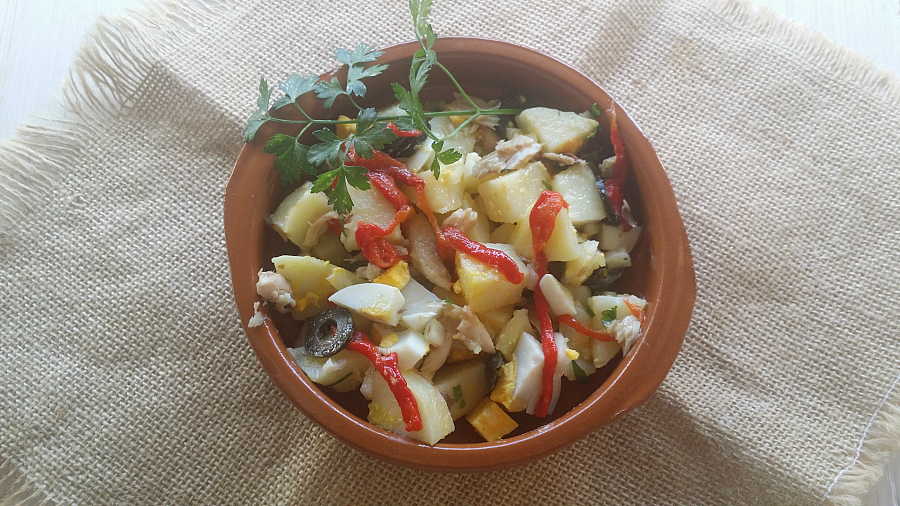 Finalmente después de muchas dudas, me decidí por este delicioso plato de papas aliñás, típicas de la cocina andaluza. Supongo que, como suele suceder, existen múltiples variantes, pero esta me ha parecido sencillamente maravillosa. Bien fresquita de la nevera, es no sólo un aperitivo o primer plato ideal, sino también una cena ligera y deliciosa para estos días en los que el sol aprieta.