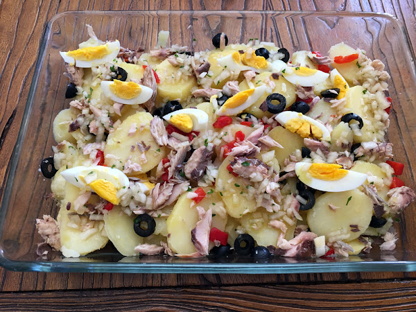 Así, todavía tibias, ponemos las papas en una fuente plana de ensalada, las aliñamos bien con la vinagreta y les añadimos el resto de ingredientes: caballa (desmigada con los dedos), las aceitunas, los pimientos y los huevos.Mira en vídeo cómo se hace esta receta: