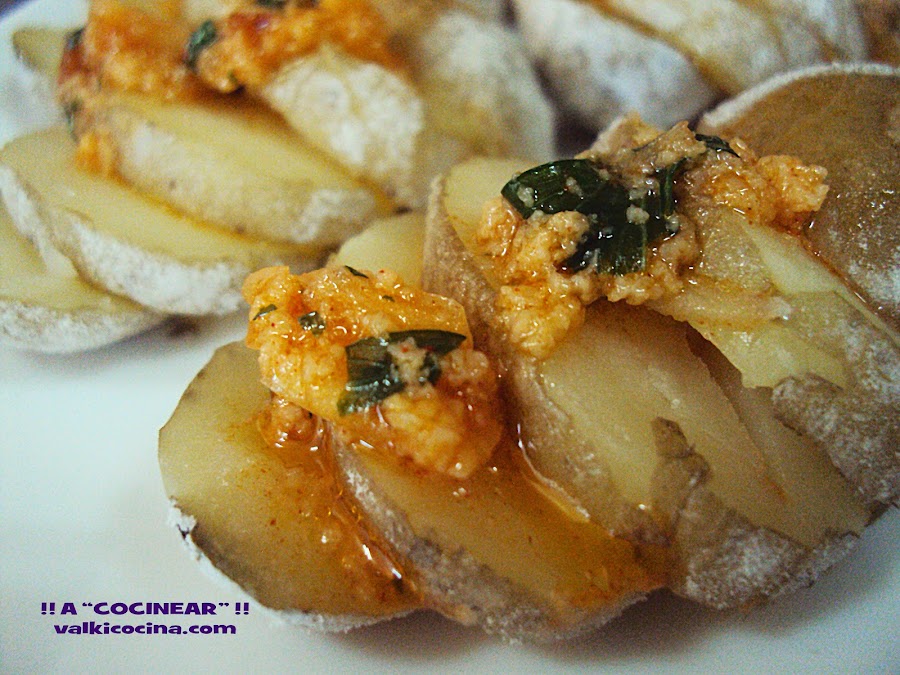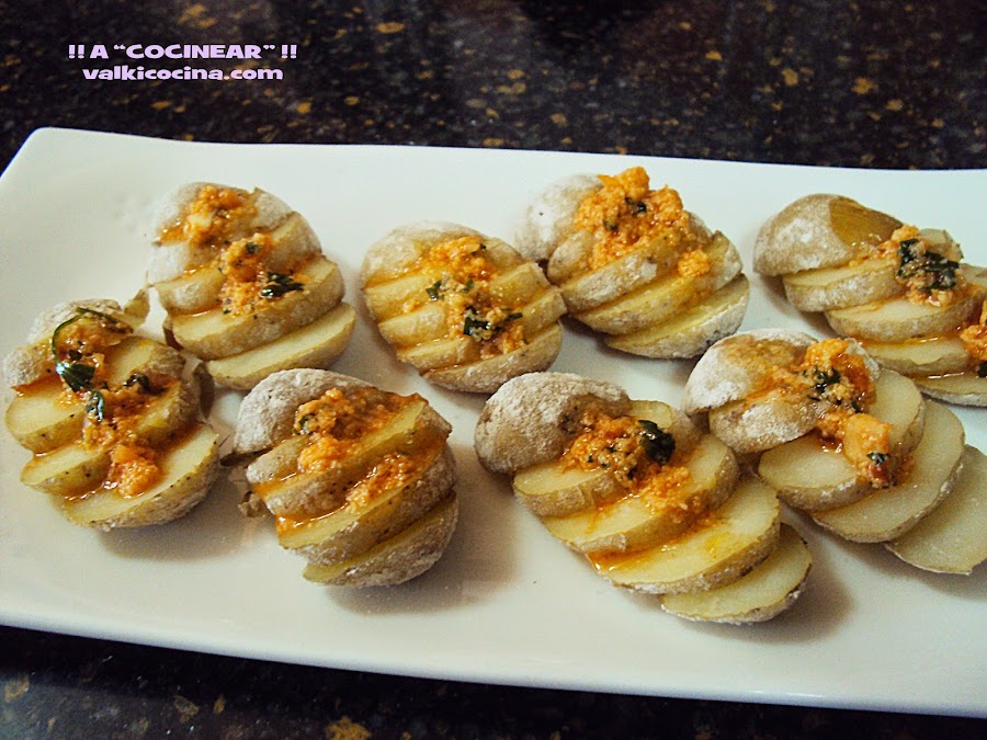 Sólo nos queda servir las patatas enteras acompañadas de la salsa, ... o servir ya cortadas.