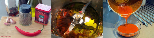 Colocar en el vaso de la batidora los ajos, el chile y el comino y triturar bien fino. Añadir la sal, el aceite, el vinagre y el pimentón y batir hasta que la salsa quede ligada.