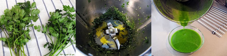 Colocar en el vaso de la batidora el cilantro, el perejil y el ajo y picar finamente. Añadir la sal, el aceite y el vinagre y batir hasta que la salsa quede ligada. El perejil se añade para obtener un color más intenso y suavizar el sabor del cilantro.
