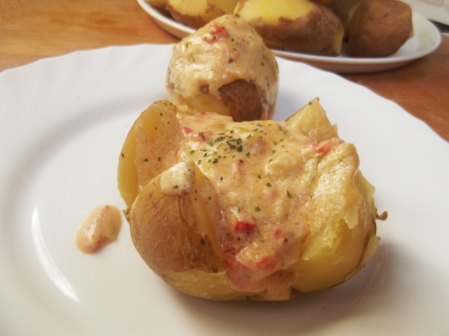 Picar finamente el pimiento y la cebolla ponerlos en una sarten con sal, comino y pimienta a rehogar, cuando ya estén brillantes agregar el tomate finamente picado y sin piel, revolver y dejar al fuego unos 5 minutos, incorporar la nata (crema de leche) revolver y esperar unos minutos a que se incorporen los sabores, retirar del fuego y agregar el queso, revolver hasta que se derrita y regar por encima de las patatas. Servir caliente.