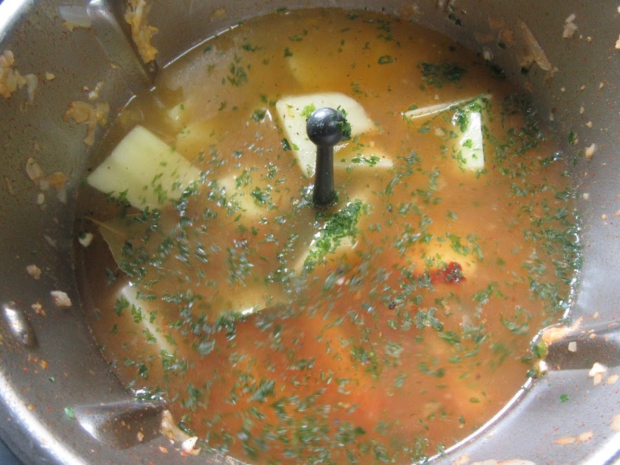 Podéis chafar alguna patata ya cocida para que trabe el caldo.