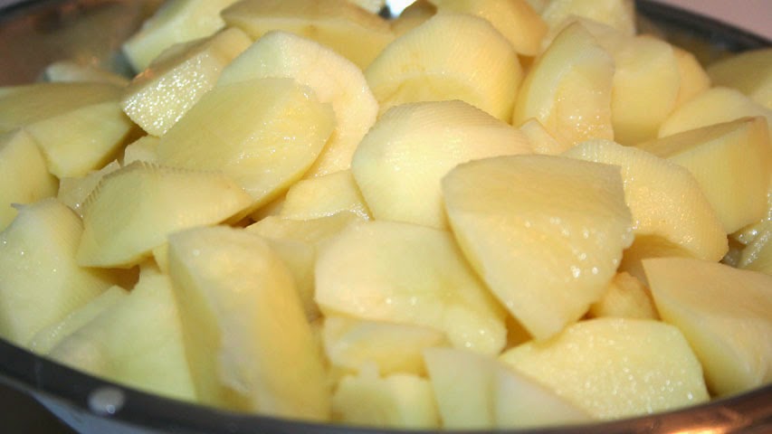 Pela, enjuaga, repasa y corta las patatas chascándolas.