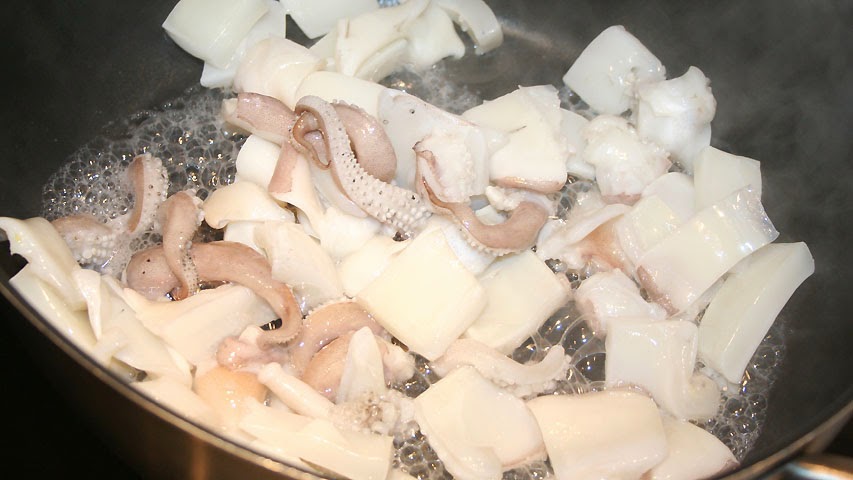 Corta la jibia en trozos hermosos, como de unos dos centímetros.