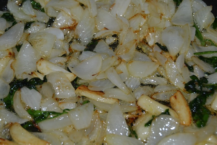En una cazuela o cacerola ponemos el aceite y pochamos la cebolla, los ajos y el perejil con un poco de sal.
