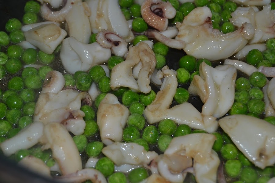 En el aceite que nos quedo, ponemos el choco y lo rehogamos junto con los guisantes.