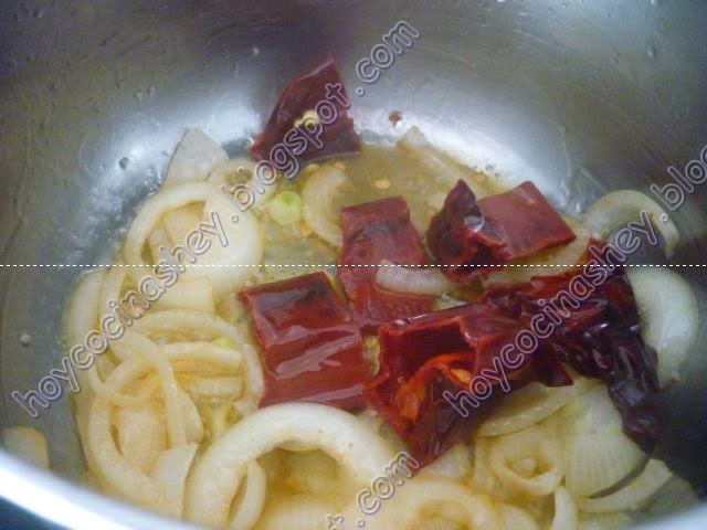A continuación ponemos el chile guajillo hidratado cortado en trozos medianos:
