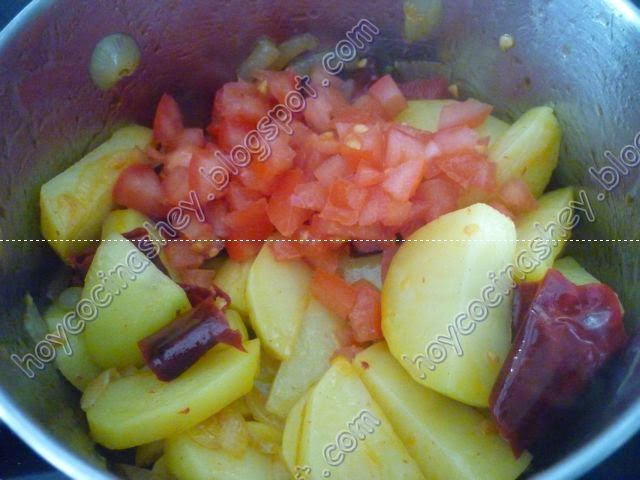 Pasado un par de minutos agregamos tomate cortado en cuadritos: